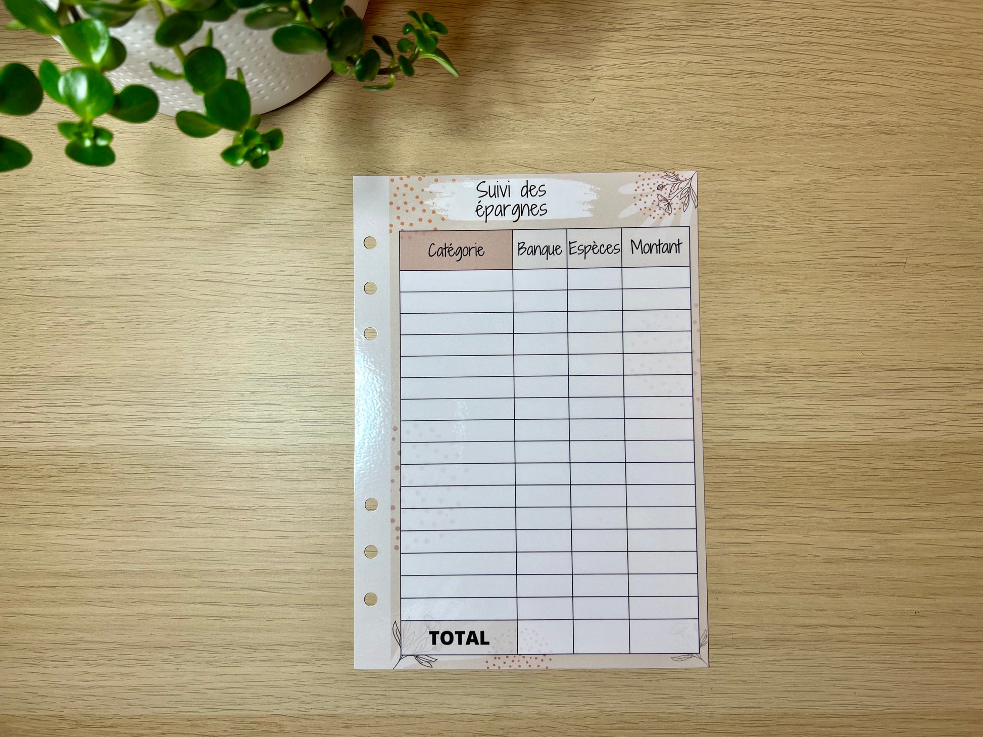 A6 ou A5 fiche suivi des épargnes plastifiée perforée