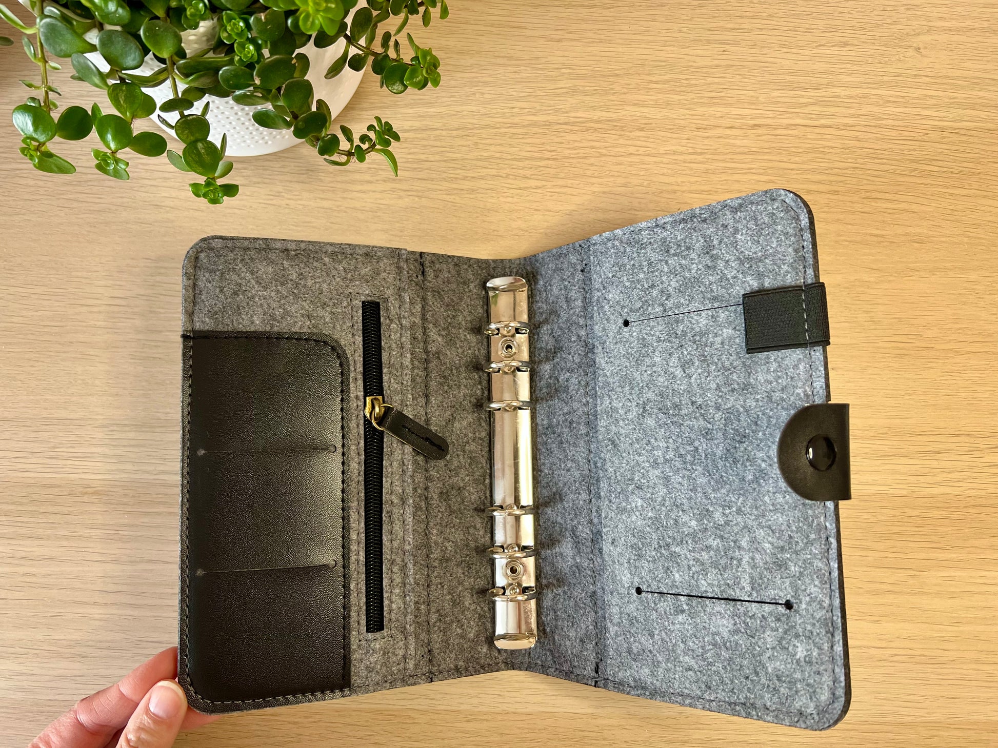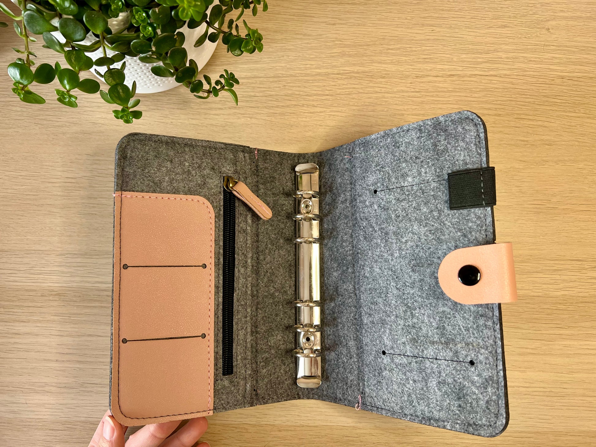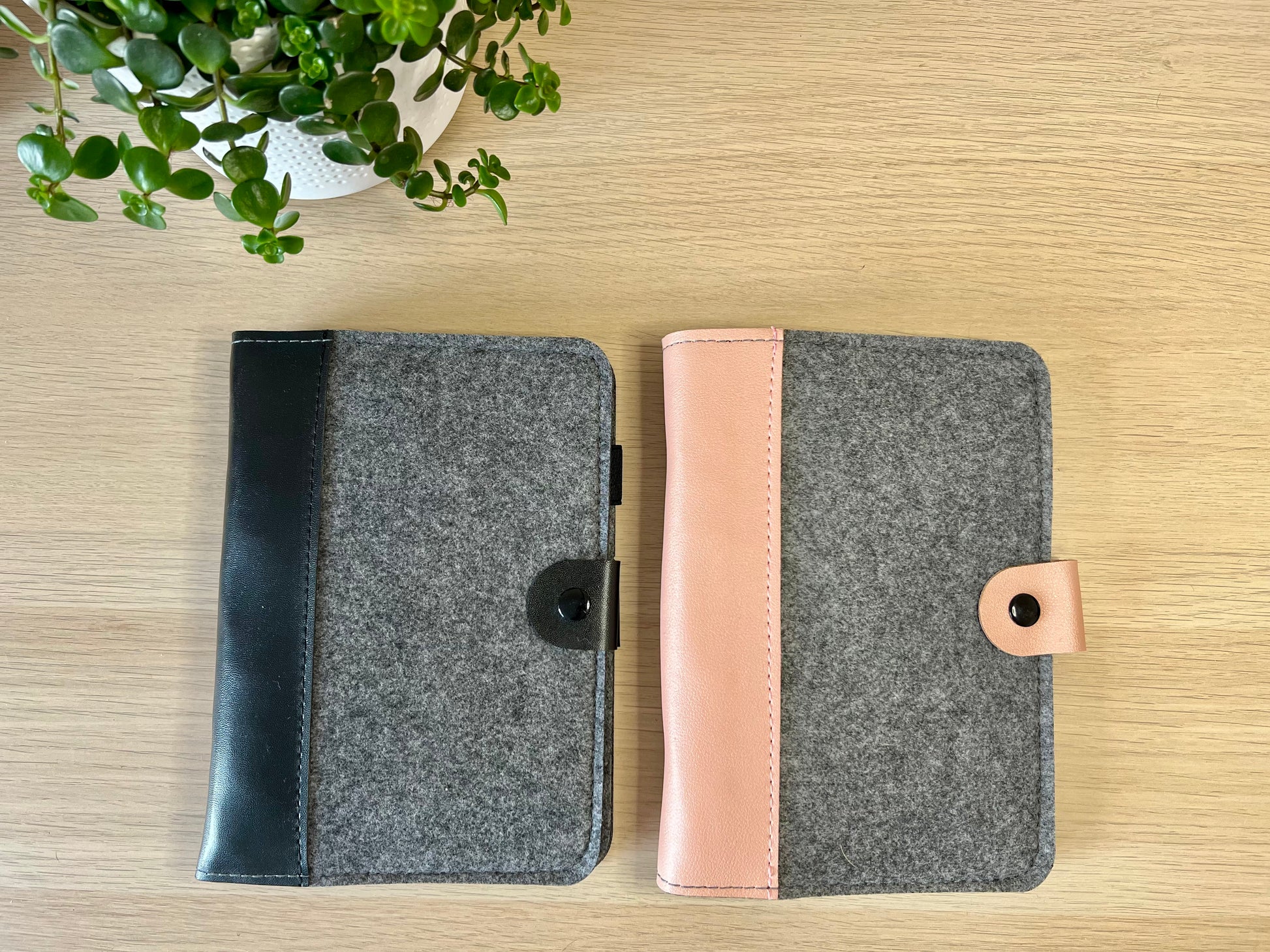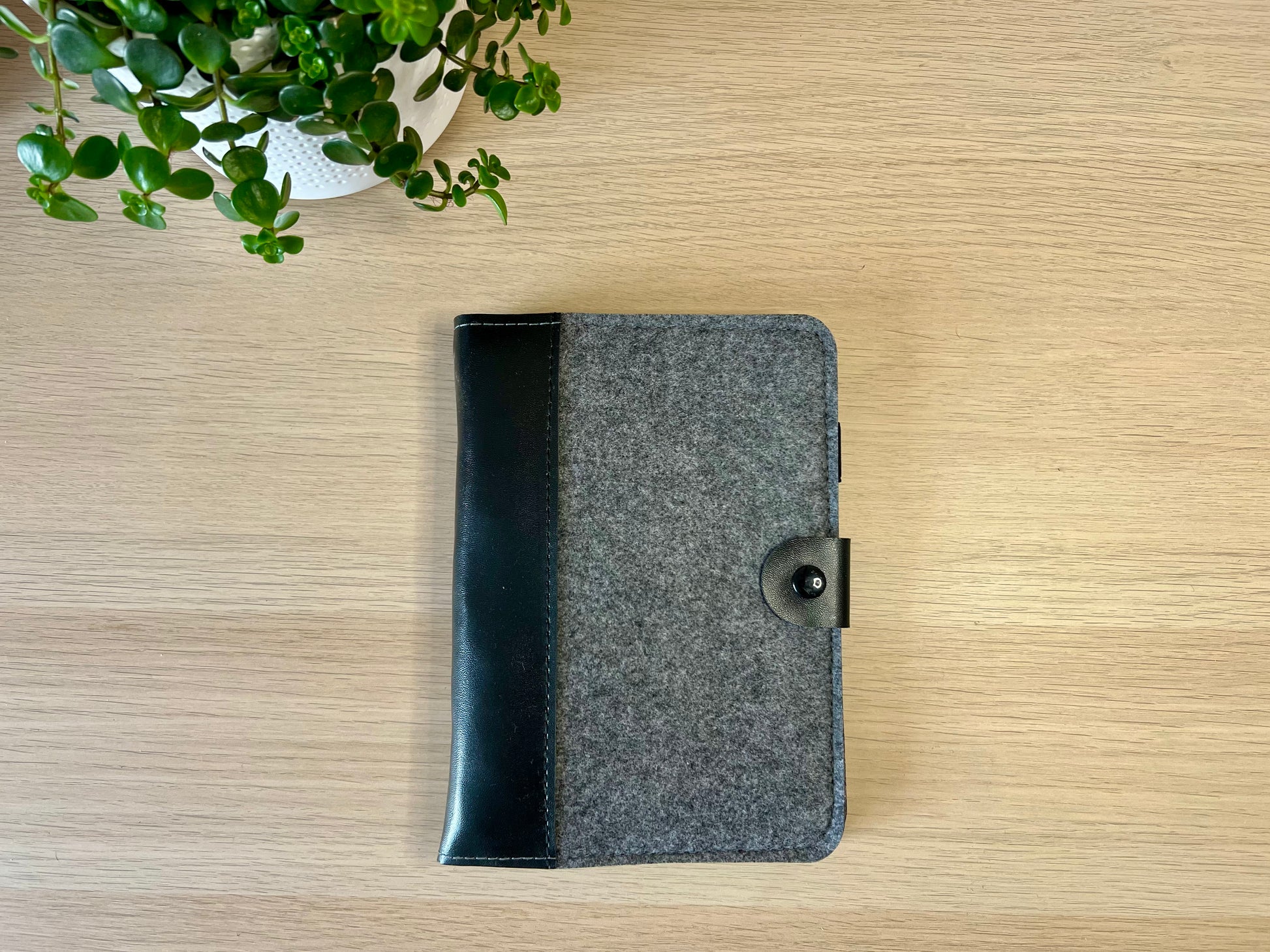 Le classeur fait 19cm x 14cm, il est fabriqué en feutre similicuir et est assez souple.