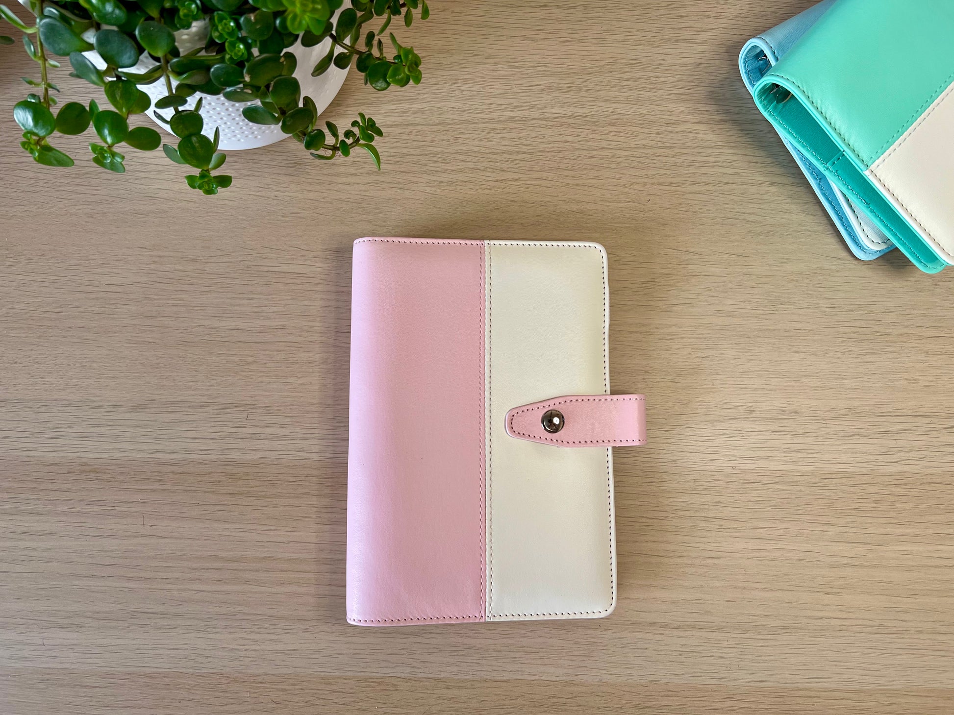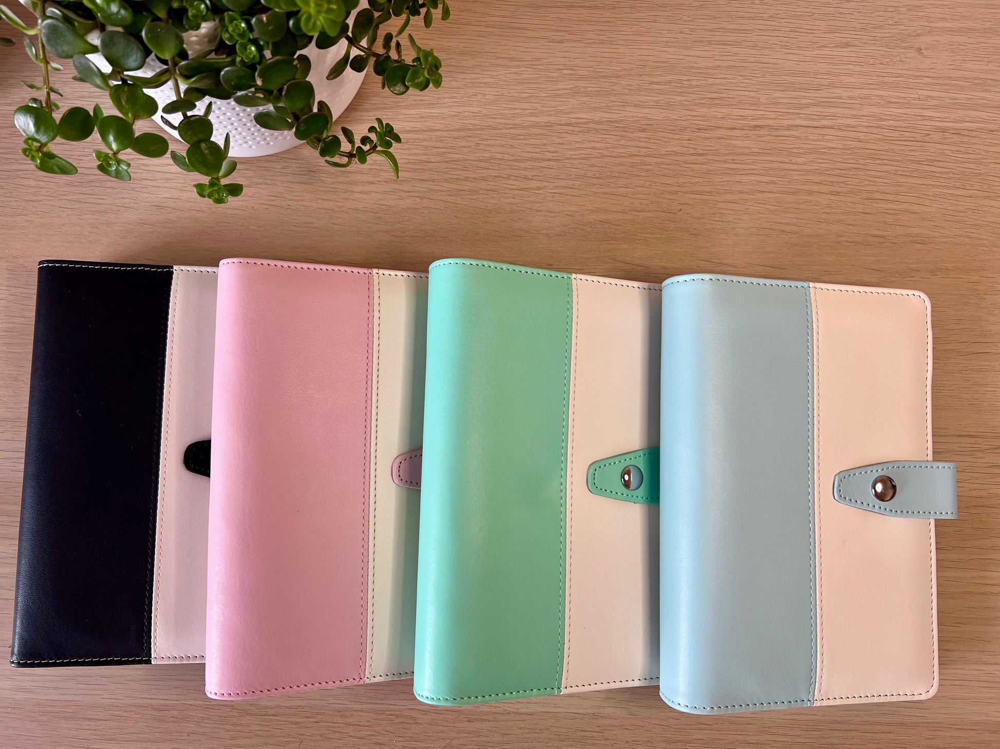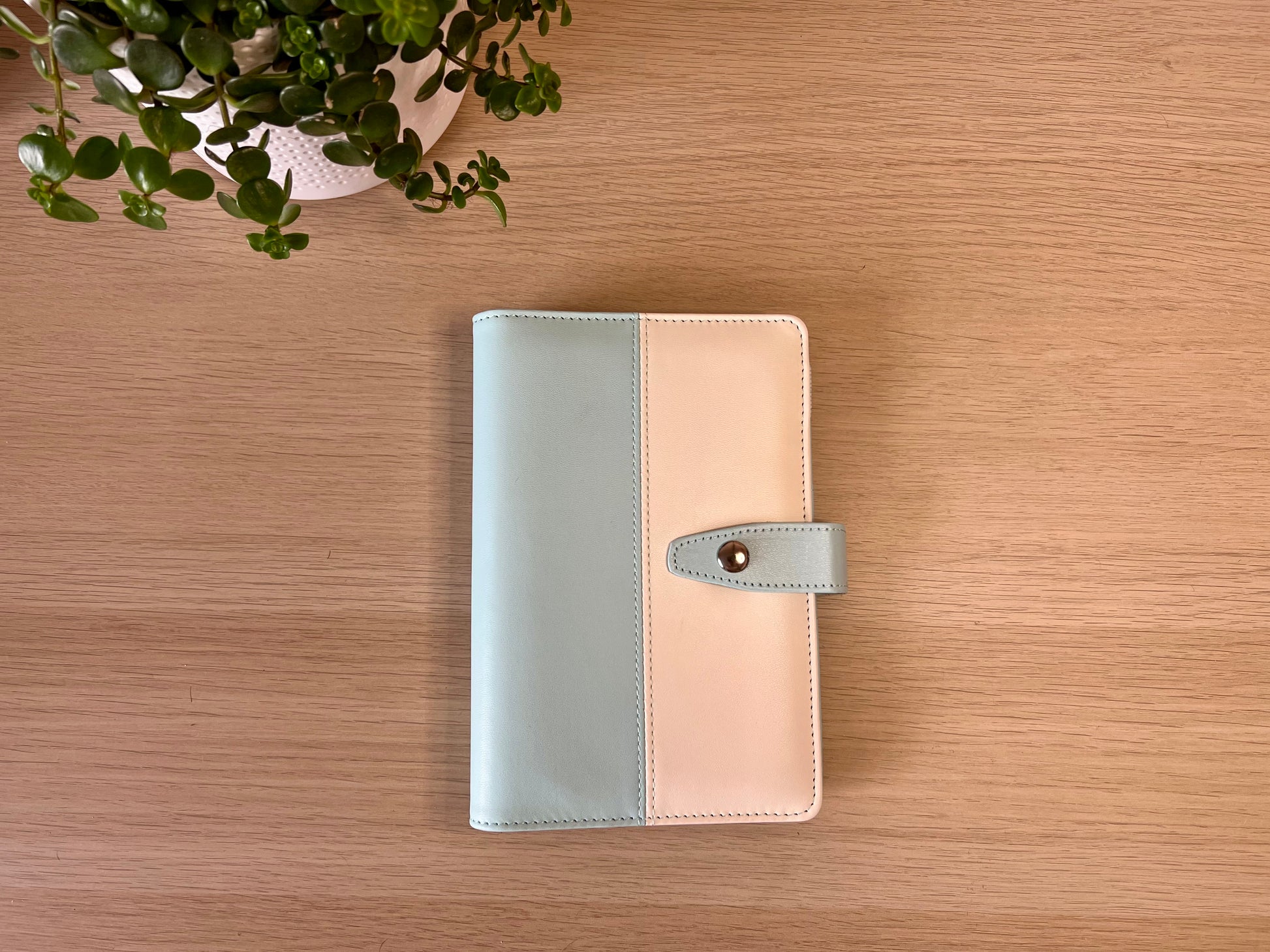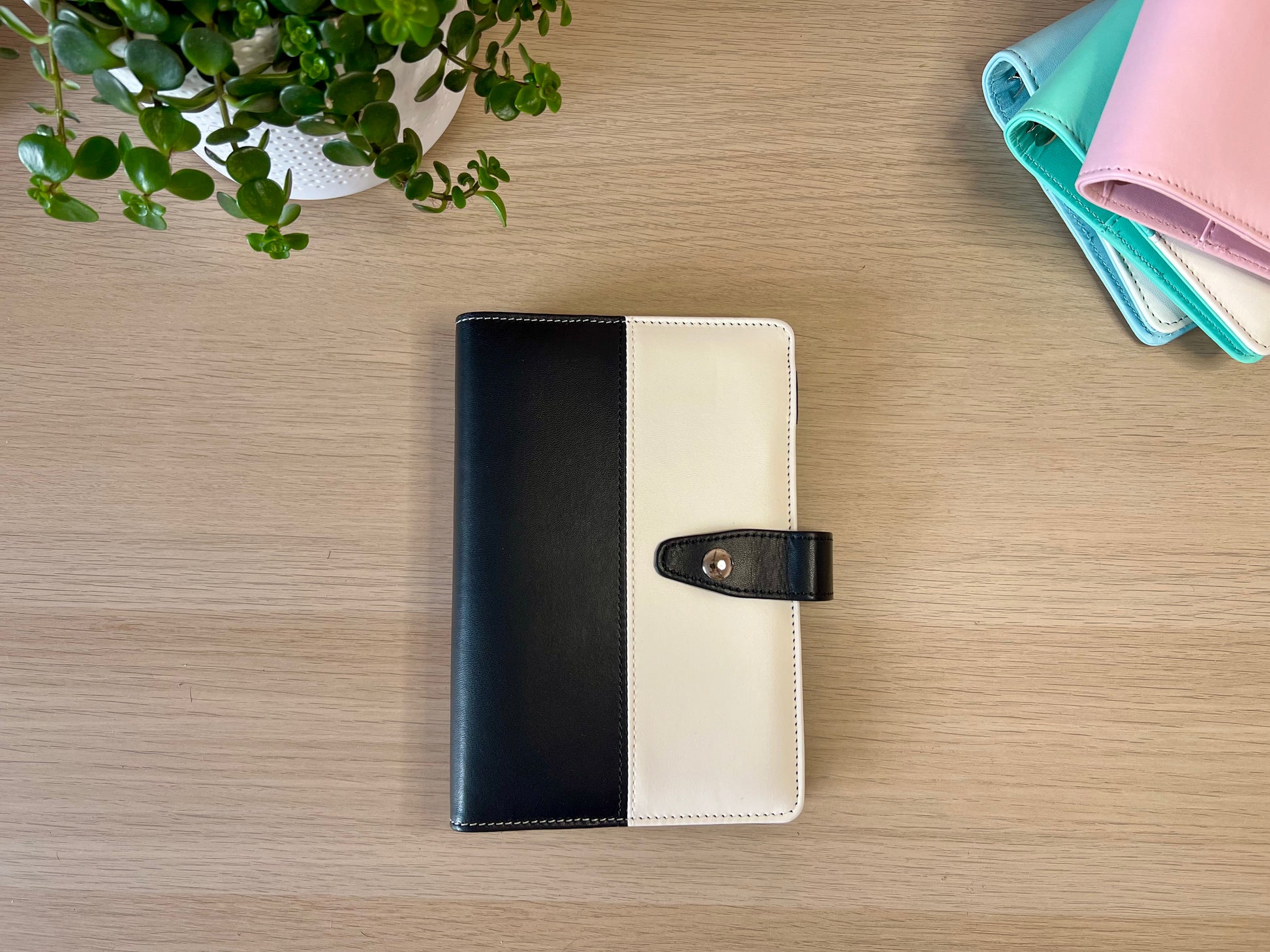 Le classeur fait 19cm x 14cm, il est fabriqué en similicuir et est rigide et épais.