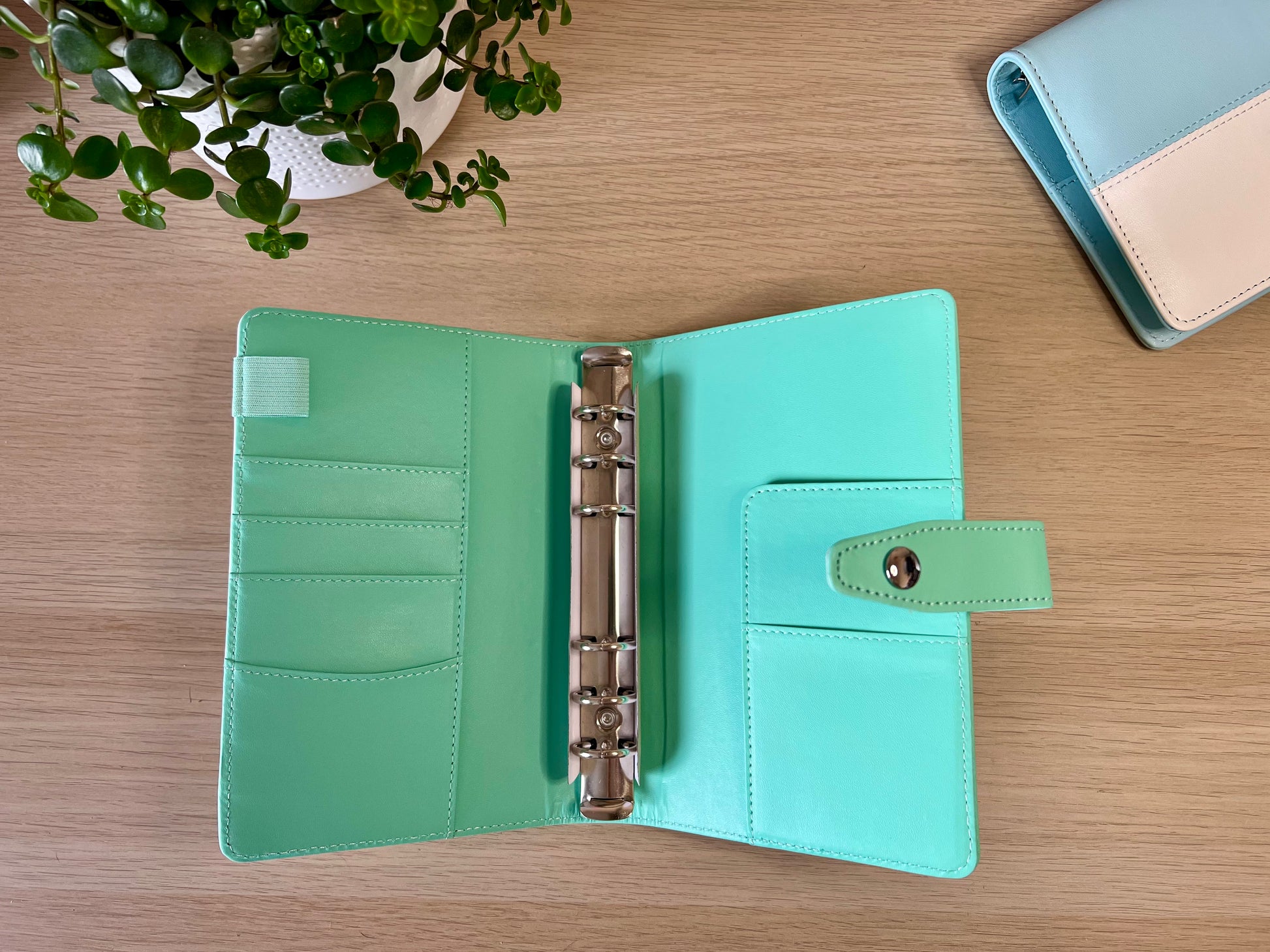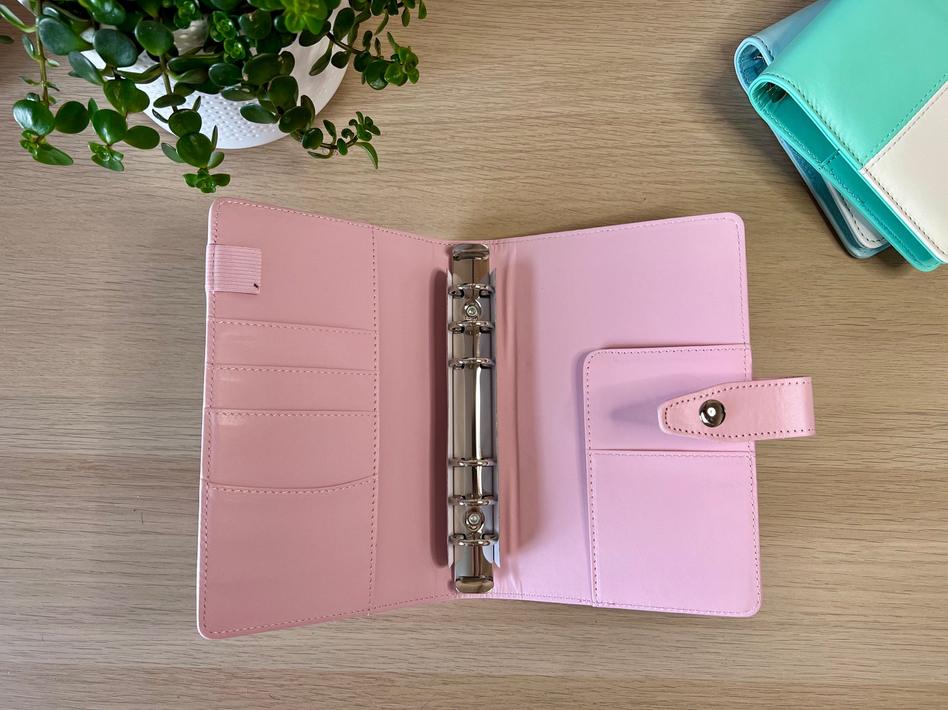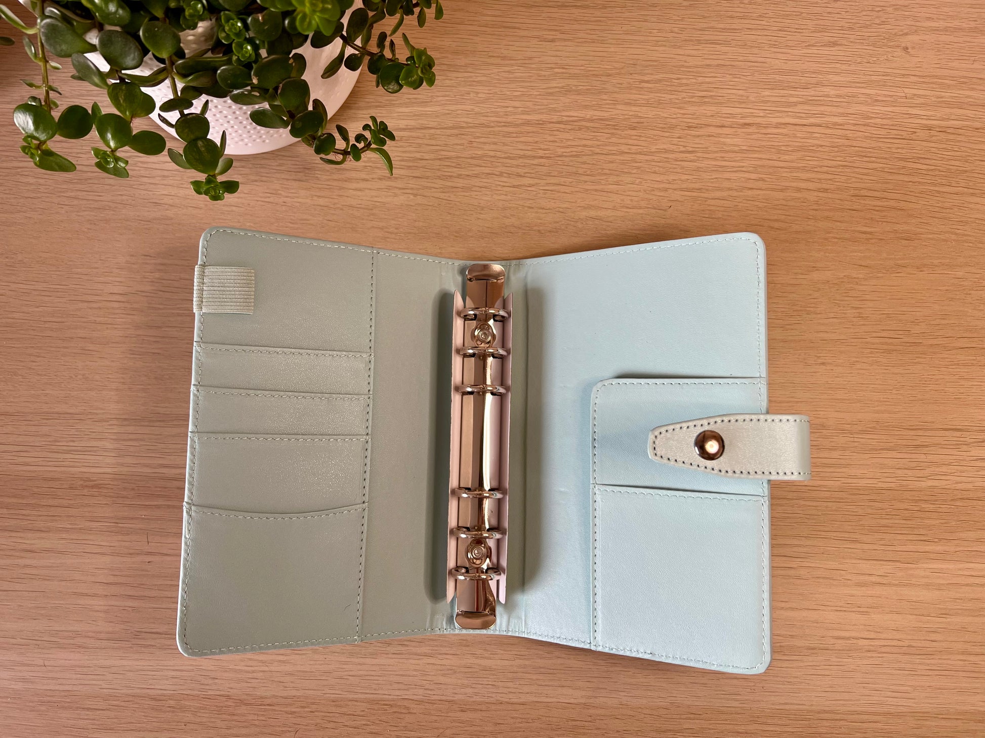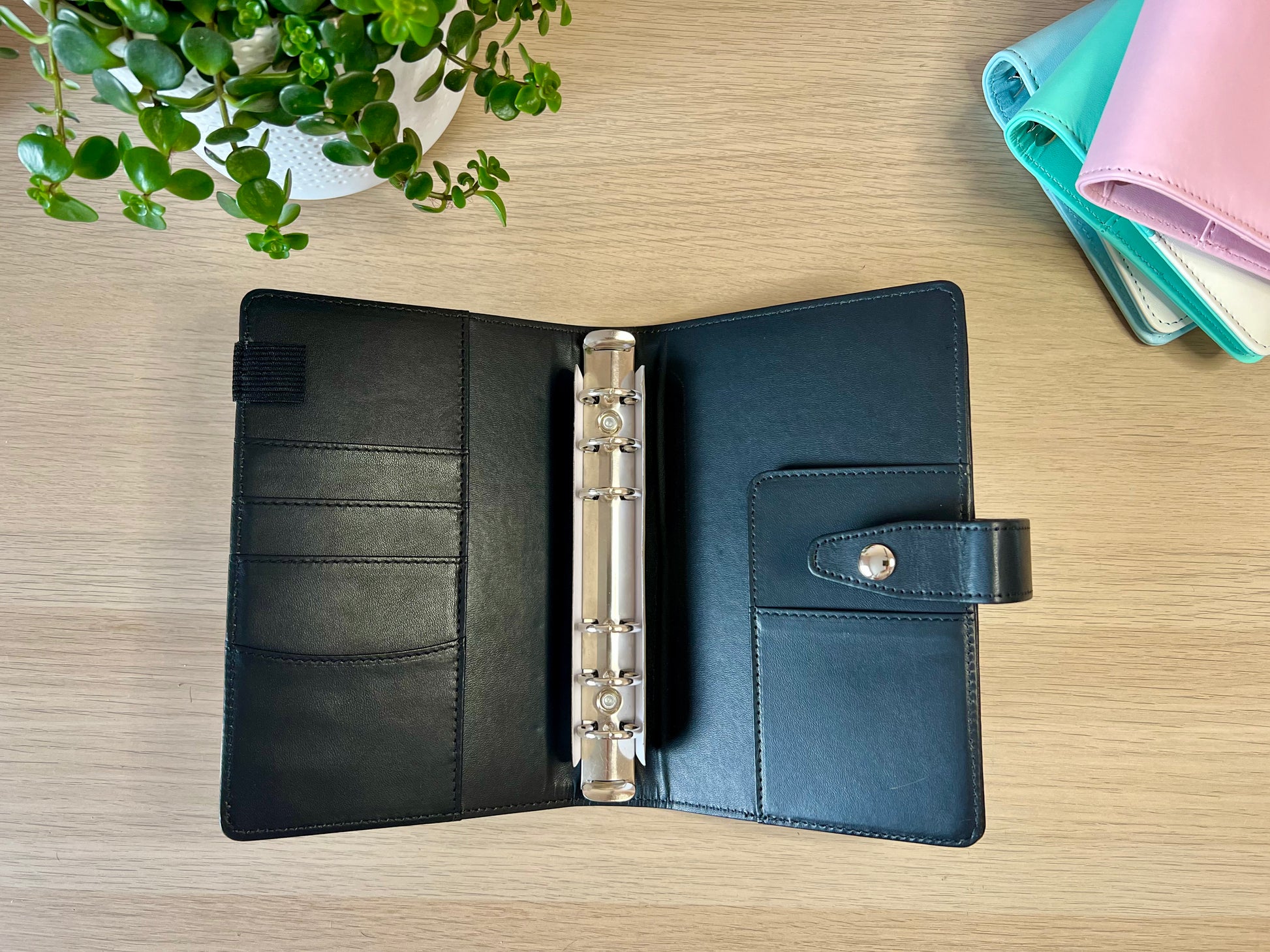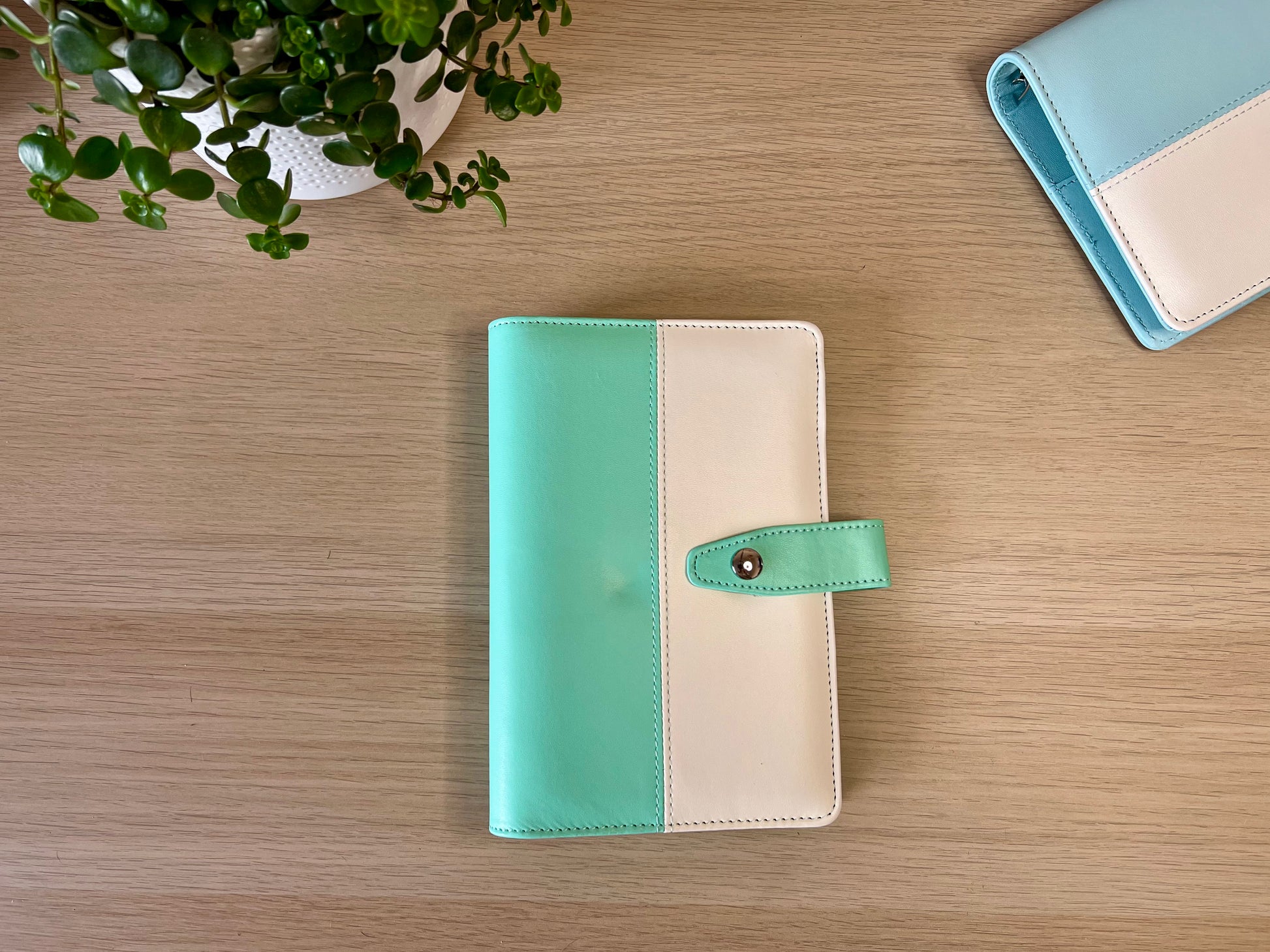 Le classeur fait 19cm x 14cm, il est fabriqué en similicuir et est rigide et épais.
