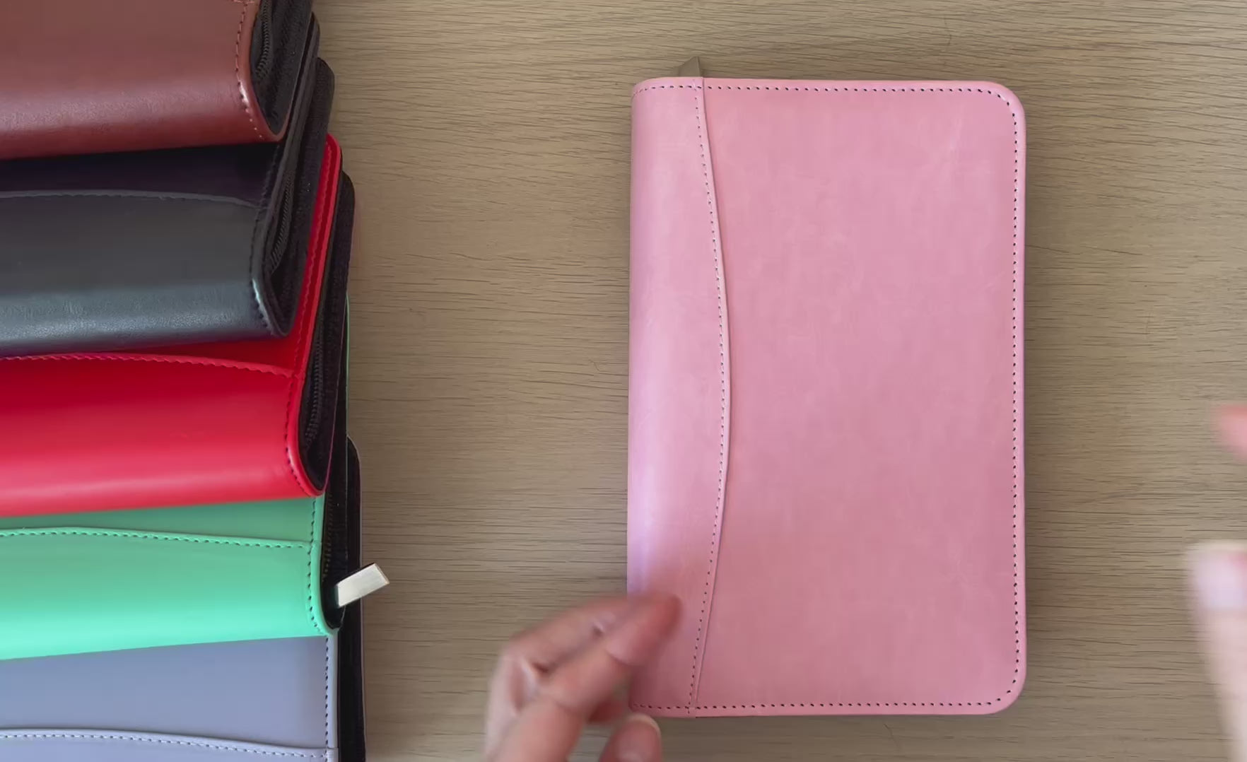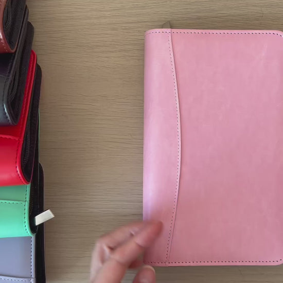 Le classeur fait 14cm x 22cm, il est fabriqué en similicuir et est rigide et épais.