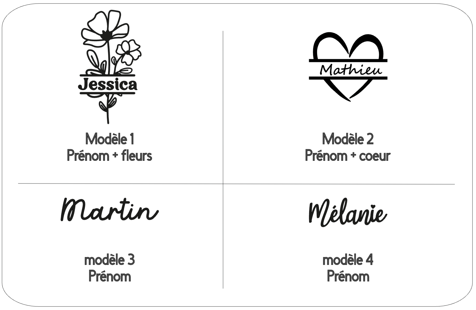Merci d'indiquer le choix du modèle (1, 2 , 3 ou 4) ainsi que le prénom dans la case prévue à cet effet